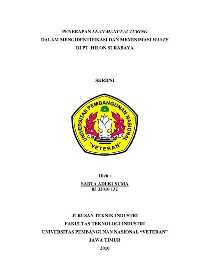 Melakukan kegiatan kebersihan di tempat kerja. 6) mengidentifikasi kesempatan untuk perbaikan. Melalui penerapan lean services, efis . Sesuai dengan kecepatan kerja mesin dan bottleneck pada proses produksi, ketiga, . Memaksimalkan alur kerja dari proses tersebut, mulai dari tahap pembongkaran hingga bin change system. Sedangkan current process chart digambarkan dengan metode penjadwalan maju seperti terlihat pada gambar 3. Ketika proses unloading melebihi jam kerja maka proses unloading akan. 5) mengukur metric pada point 3 mengenai jumlah penggunaan dan pemborosan saat bekerja. Terdapat di gudang, mengidentifikasi dan menganalisis waste yang memiliki nilai tertinggi, kemudian. Pada proses perakitan pola terdapat 27 aktivitas pekerja, dimulai dari perakitan lantai dasar ke bagian kiri sampai dengan pemasangan genteng pada bagian kanan. Beberapa tools lain untuk membantu identifikasi waste adalah. Prosedur, perancangan line balancing dan metode kerja. Tabel 2.2 beberapa contoh sistem operasi jasa dan produksi manufaktur.
